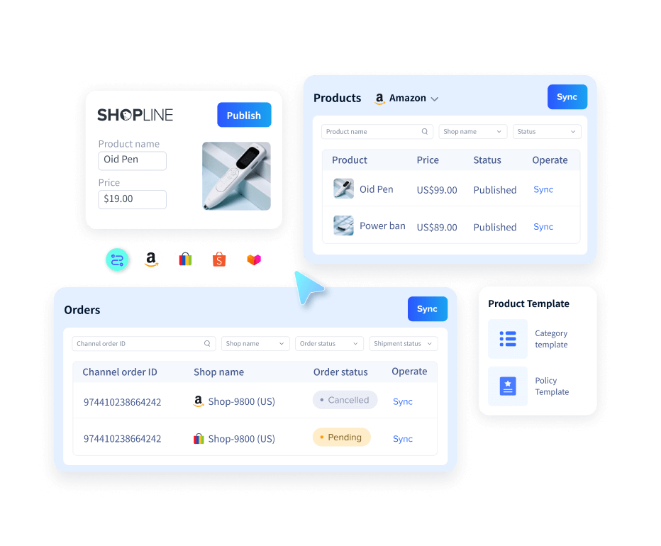 直接在 SHOPLINE 无缝整合与管理您的多个销售渠道,如亚马逊、Shopee、eBay、Lazada、Zalora 等电商平台